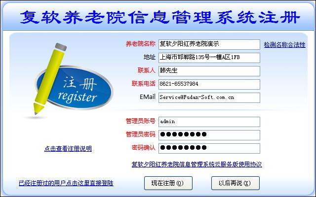 5、点击【现在注册】按钮后,如果提示“恭喜您!注册成功了,马上带您进入系统!”的反馈信息,那么就真的恭喜您了,您现在就可以开始使用我们的夕阳红养老院系统了!